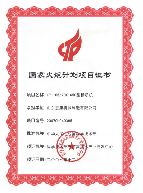 國家火炬計(jì)劃項(xiàng)目證書