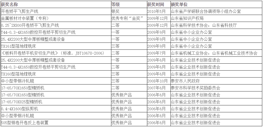 “T44-5~25.4×2200開卷矯平移動(dòng)剪切生產(chǎn)線”入選“2010年度中國國內(nèi)首臺(tái)套技術(shù)裝備示范項(xiàng)目”,“大型數(shù)控中厚板精整成套設(shè)備產(chǎn)業(yè)化項(xiàng)目”被列入2011年山東省自主創(chuàng)新成果轉(zhuǎn)化重大專項(xiàng)計(jì)劃;